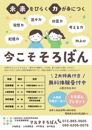 マルタそろばん教室では、そろばん学習を通して、お子様の可能性を最大限に引き出す教育を提供しています。