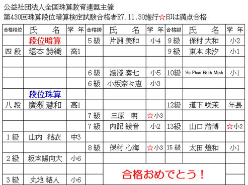 | 公益社団法人全国珠算教育連盟主催 第407回段位暗算検定試験で 十段合格 見 友梨 中学1年生 |